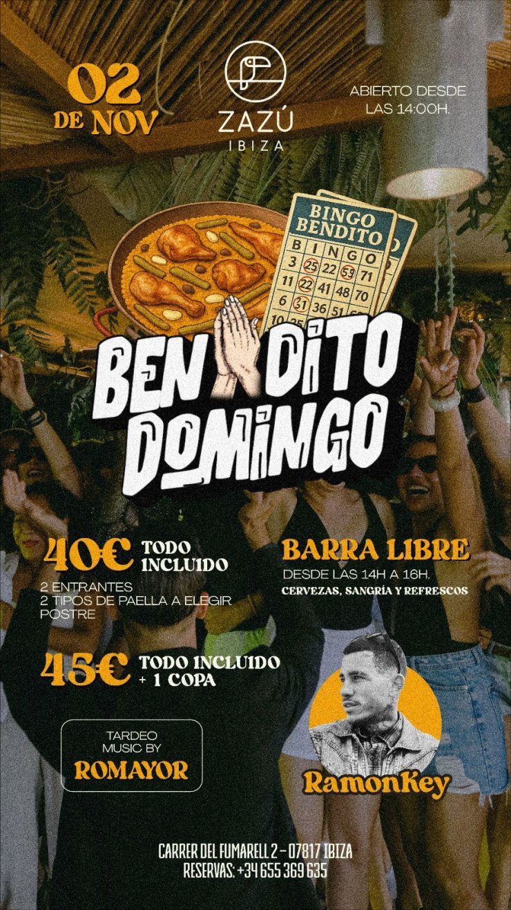 Während der Wintersaison präsentiert das Zazú Ibiza jeden Sonntag von 14:00 Uhr bis Mitternacht Bendito Domingo (Gesegneter Sonntag) – ein ganztägiges Erlebnis, das ein köstliches Mittagessen mit einem Nachmittag und Abend voller Musik, Bingo und Partyspaß verbindet.