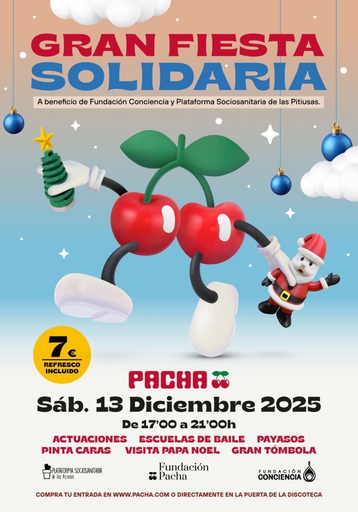 Das Pacha liebt es, Weihnachten mit allen Altersgruppen zu feiern. So kommt es zu dieser tollen Party, die speziell für die Kleinen und für einen guten Zweck organisiert wird. Der gesamte Erlös geht an die Fundación Conciencia y Plataforma Sociosanitaria de las Pitiusas, eine Plattform, die sich aus 17 Vereinen zusammensetzt, welche sich der Arbeit mit Menschen auf Ibiza und Formentera widmen, die von sozialer Ausgrenzung bedroht sind oder besondere Bedürfnisse haben.