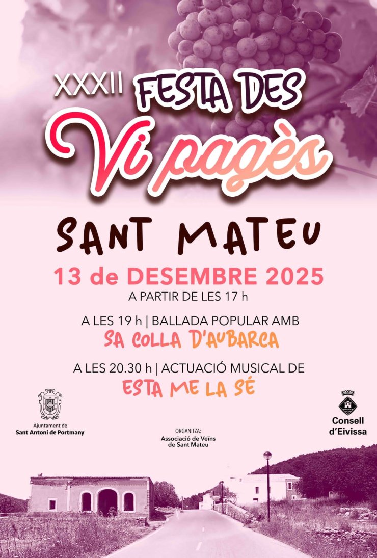 Das kleine Dorf San Mateo, umgeben von fruchtbarer Erde, die ideal für den Weinbau ist, beherbergt eines der interessantesten jährlichen Feste der Insel namens Festa des Vi Pagès (Landweinfest), das den Höhepunkt des Herstellungsprozesses des ibizenkischen Weins, dem berühmten „Vi Pagès“ (Landwein) kennzeichnet.