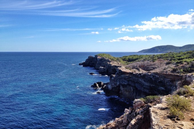 My two companions and I took the walk at a leisurely pace, and with plenty of photo breaks...which, believe me, you will definitely be wanting to make. From the cliff edge, and especially on such a clear day, we could see the lighthouse in front of us and another of Portinatx's famous landmarks, a pirate tower, behind us. The sea, clear and twinkling beneath us and the dramatic, craggy landscape surrounding us, I didn't think I had ever seen Ibiza look quite so beautiful. We could even see Mallorca, at 72 kilometres away, quite easily visible in the distance.
