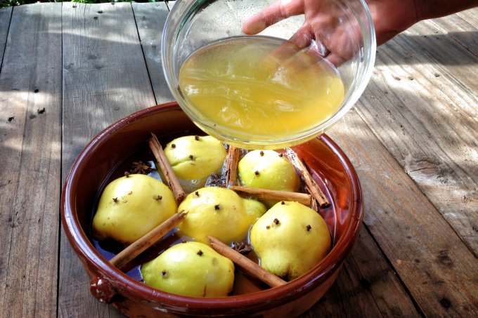 Put three cloves in each quince half and place in buttered baking dish skin side down.