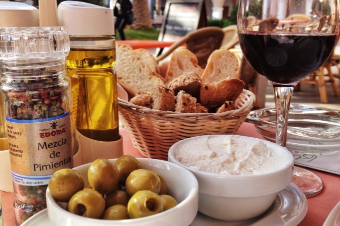 We were served first with fresh bread and alioli, and a dish of olives, but our tapas soon followed and were set out attractively on the table. Just take a look at this for a perfect Ibiza lunch-time tapas selection...