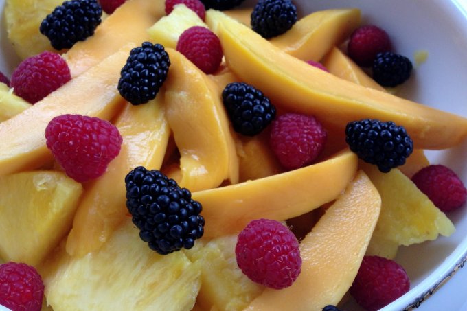 Mix the mango and pineapple, careful not to squish the mango. Add the berries just before serving so as not to discolor the salad.