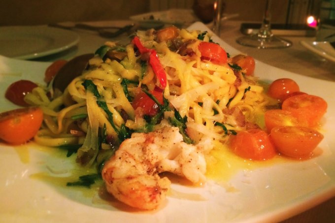 Linguini with prawns followed. Served with cherry tomatoes and rocket, plus a twist of ginger and chilli which gave it an unexpected but pleasing kick. Next up was tuna steak (served with or without pancetta bacon) accompanied by a salad of mixed leaves, marinated pumpkin, basil and mint vinaigrette. Yet again, the chef had achieved the perfect balance of flavours and it complimented the tuna beautifully.