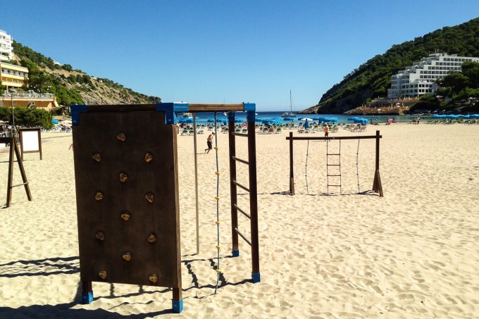 The first thing to impress us about this large, wide, golden sandy beach was the stunning natural setting, with dramatic pine-studded mountains sloping steeply down to the sea. The mountains that encircle Cala Llonga ensure that this resort is sheltered and form a powerful suntrap, making it popular with those looking for maximum bronzing factor! In fact, looking around, we noted the particularly wide mixture of visitors that this beautifully self-contained resort attracts.