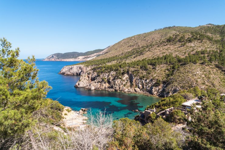 The small and picturesque Cala d'en Serra beach is located on the most northerly tip of the island, close to Portinatx, though far enough away to be considered a peaceful paradise. This secluded horseshoe-shaped sandy beach is the perfect Ibiza getaway from the madness of the crowds. From up above, the view of this beach is simply magical.