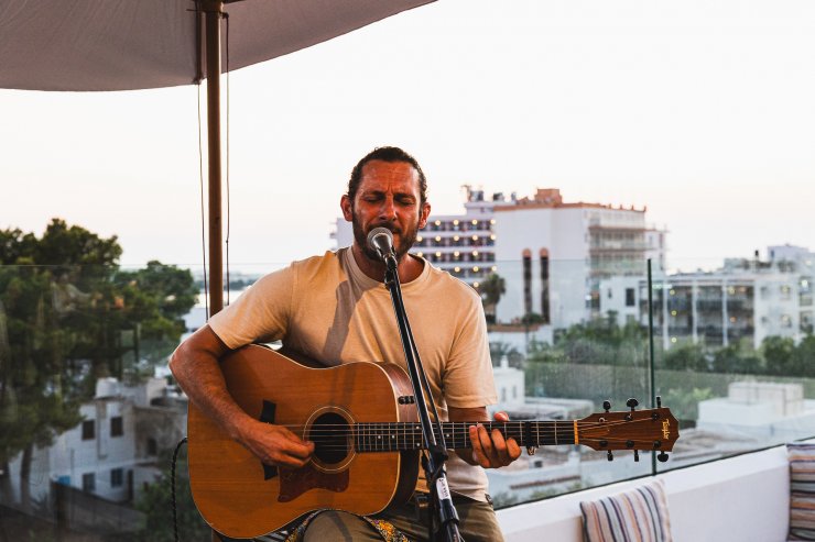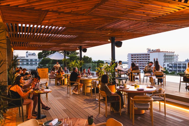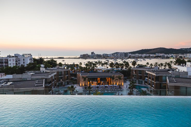 Vor euch taucht der Sonnenuntergang über der herrlichen Skyline von San Antonio den Himmel in Orange- und Lilatöne, die langsam ins Dunkel übergehen, während die funkelnden Lichter von Ibizas zweitgrößter Stadt zum Leben erwachen. Wenn ihr genau hinschaut, könnt ihr einen Blick auf das pulsierende Leben unter euch erhaschen – ein starker Kontrast zur entspannten Atmosphäre auf dem Dach.