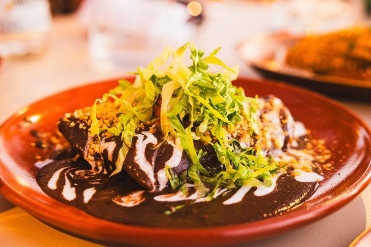 Die klassische Enchilada war mit viel Hühnchen gefüllt und mit einer erdigen, wärmenden und leicht cremigen Mole aus frittierten Bohnen übergossen. Guajilo-Chili gab der Sauce eine fruchtig-rauchige Note.