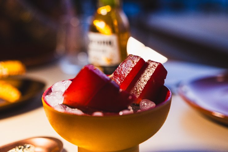 Ein erfrischendes Zwischenspiel: Stücke süßer Wassermelone, durch Osmose mit Mezcal angereichert, sorgten für einen wirklich interessanten Geschmack. Die Süße der Frucht wurde durch den klassischen Likör verstärkt, mit einer leichten Rauchnote im Hintergrund.