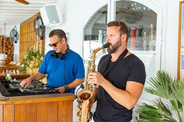 Mit DJ Elliot an den Decks passt die Musik – Balearic Chill, ideal für ein gemütliches Mittagessen im mediterranen Stil – perfekt zum entspannten Ambiente. Im Laufe der Zeit nimmt, während auch unsere Tischnachbarn den Abend genießen, das Tempo zu und er wird von einem Saxophonisten begleitet.