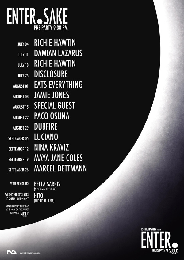 Well they dragged their heels on it but finally there is some news on line-ups for ENTER! Richie Hawtin really made us wait for this one – and he's still only given us a teaser – but if the first announcement is anything to go by, ENTER will have a hugely strong second season in Ibiza (no surprises there). Discoteca and Terrazza DJs still remain a mystery but we can now reveal the headliners set to play ENTER.Sake, the pre-party-which-is-actually-part-of-the-main-party previously held in El Salon and now moving across the building to the sunset terrace.