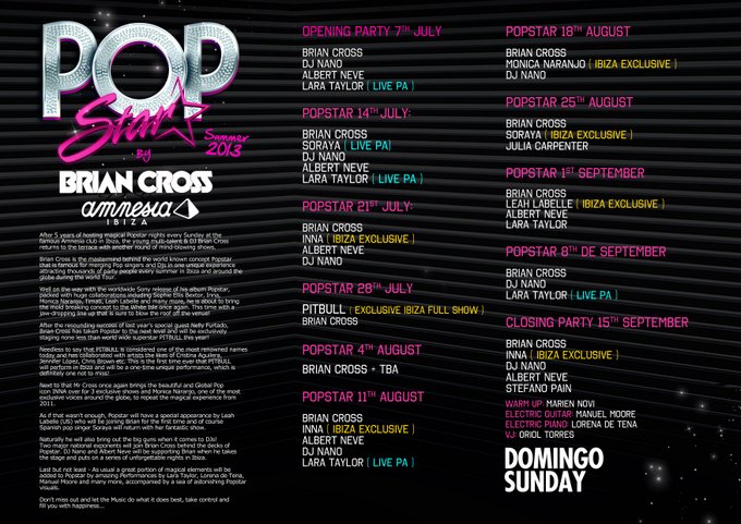This summer will see DJ & Popstar mastermind Brian Cross bringing you a sixth season of pop music delights to what is arguably one of Ibiza's best venues, the Amnesia Terrace, and now the line up has been announced it looks like it's set to be another great summer for Pop Star.