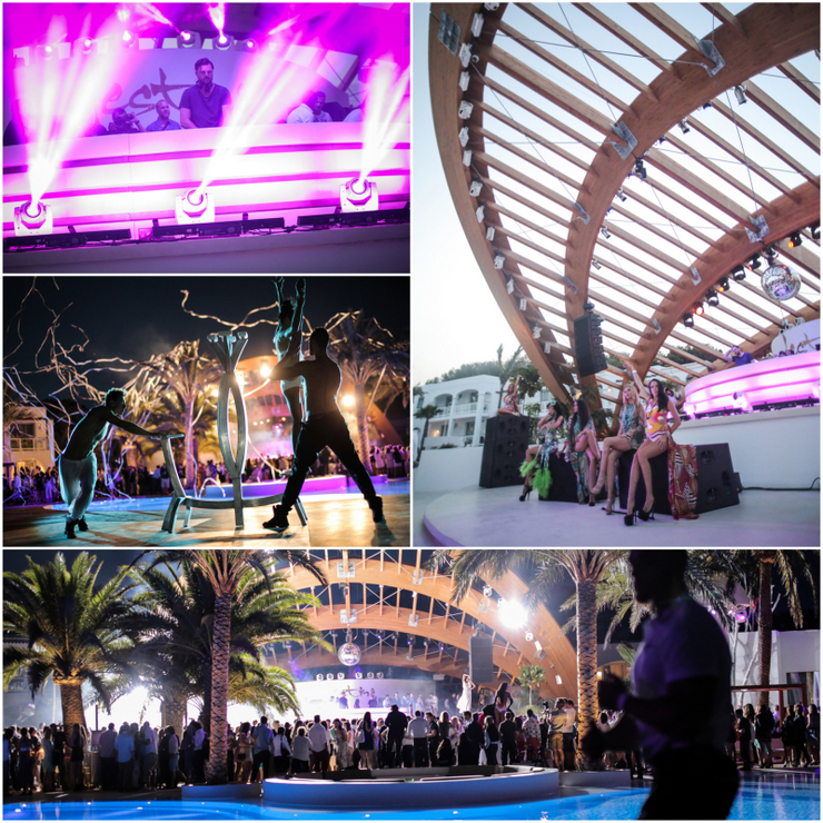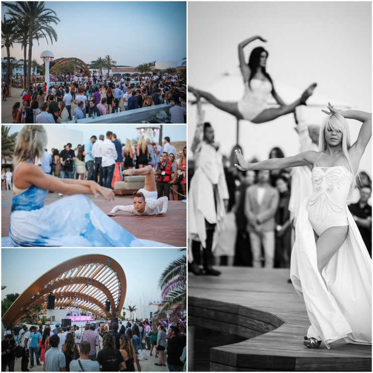 Visual entertainment was also abound, with a collaboration from Pacha and Nu-Art, a company of 28 international artists, dancers, models and acrobats. These guys were great, executing brilliant dance choreography on a stage set up by the pool which blew all the usual club “dancers” on the island (read: “posers”) out of the water. Highlights included a zombie eyed back-flipper, silhouettes against an artificial moon on the roof, freakishly flexible girls, aggressive salsa and cloud-print hoop skirts. I was delighted to hear that this sort of entertainment will be presented at the resort every night after dark!