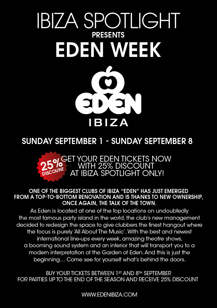 Announcing an exclusive Spotlight and Eden promotion which will work out very well for us clubbers. During the week starting Sunday the 1st of September until Sunday the 8th of September, all tickets purchased on Spotlight for any Eden event will receive a 25% discount! So as long as you buy on Spotlight within this week, you'll get the discounted price for any party at Eden until the end of the season.