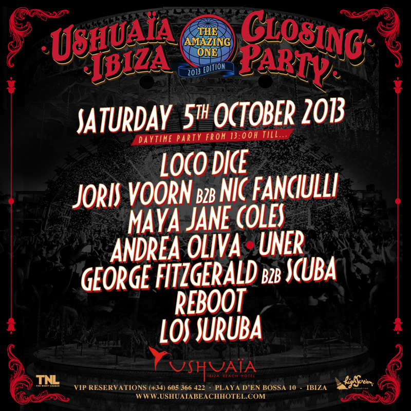 Ushuaïa finishes the season just the way it began - bringing the underground sound out into the open air. Saturday the 5th of October will be a rowdy celebration of the techno and house scenes in Ibiza, with a line-up which reflects the musical direction Ushuaïa explored this season. Your final chance to party by the pool will be soundtracked by none other than Loco Dice, Joris Voorn back-to-back with Nick Fanciulli, Maya Jane Coles, Andrea Oliva, Uner, George Fitzgerald back-to-back with Scuba, Reboot and Los Suruba. Quite the collection!