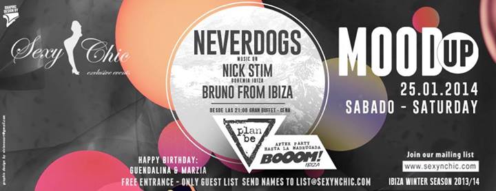 The following night, Saturday 25th January, is a two venue night as Sexy n Chic present 'Mood Up' at the oustanding semi-outdoor venue on the outskirts of Ibiza Town; Plan Be. Music On residents the Neverdogs are joined by Nick Stim and Bruno From Ibiza (he's from Ibiza and his name's Bruno BTW) for the main show, with the party taking itself back to Booom for the afterparty at around the 3/4am mark with an extended set from the Neverdogs, Nick Stim again and resident Escribano. The party starts at 9pm with those wanting to attend having to email their names to list@sexynchic.com.