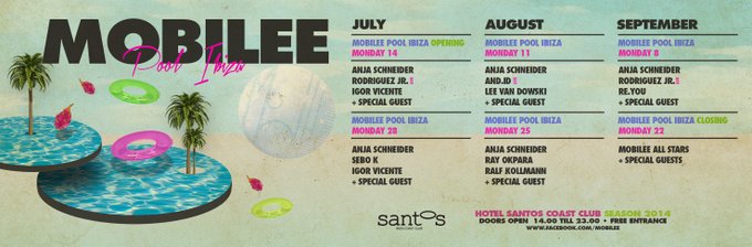 Mobilee Pool Ibiza opens Monday 14th July, 14:00 - 23:00 at Santos feat. Anja Schneider, Rodriguez Jr., Igor Vicente and William Kouam Djoko.