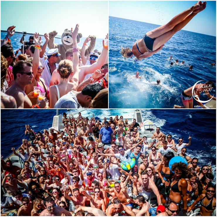 There's a buzz of excitement in the air as the hour strikes 13:30 and we are all assembled to the front of the house and start our parade down to the seaside where our boat awaits us. Greeting us on board are the sexy Cirque De La Nuit chicos and chicas eagerly pushing a glass of champy in our hands, as I head on up and make myself comfortable on the top deck of the ship. Judging by the DJ booth and the Void sound system right smack in front of me, I've made the right choice in seating, eager to get some tunes in my ears and feel the breeze in my hair.