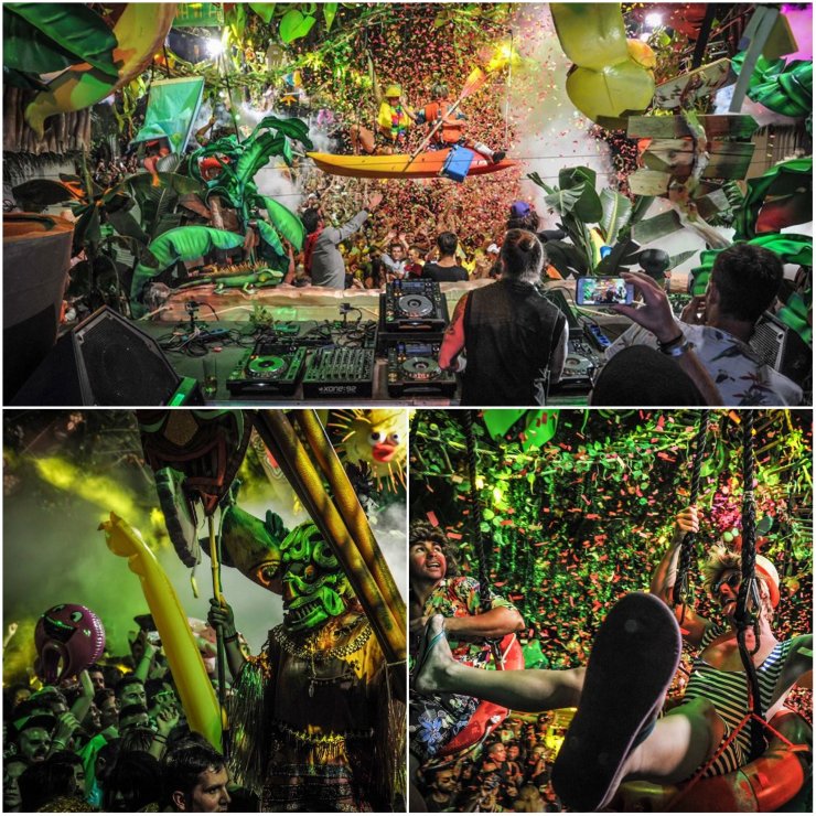 As we got into the club we made like an arrow and shot our way to the frontlines of the Main Room where Art Department had a remaining half hour till De La Swing and Toni Varga would take over with a special back-to-back set. After weaving our way through the crowd my jaw dropped in awe as I took in the décor that had completely transformed the Main Room of Space into some tropical lalaland jungle where even the rules of physics didn´t apply – strange creatures on stilts walking around blowing bubbles, little munchkins dropping from the ceiling and bouncing into the crowd, a little row boat floating across our heads, a dancing tree and all kinds of plant life on stage, with the ceiling and walls covered in greens and vines and everything in between.